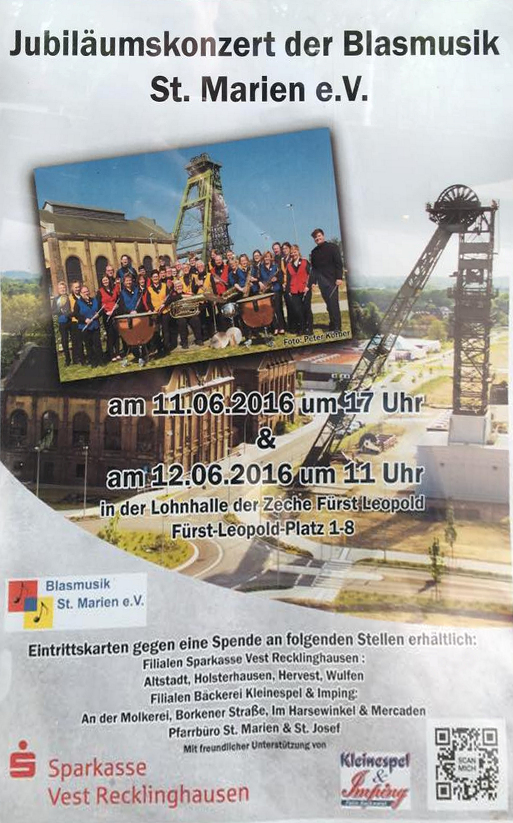 Üben und Proben – derzeit wichtige Worte im Leben der Blasmusikerinnen und -musiker! In der Vorbereitung auf diese Jubiläumskonzerte wurden die Orchesterproben, seit 2014 unter der musikalischen Leitung von Oliver Jahnich, intensiviert, Proben der einzelnen Register mit zum Teil professionellen Musikpädagogen wurden häufiger. Überhaupt liegt ein Schwerpunkt der Blasmusik St. Marien in der Ausbildung junger Musiker und der ‚Wiedereingliederung‘ Erwachsener, die ihr Intrument schon lange wieder aus der Hand gelegt hatten; dazu stehen eine Reihe von Instrumenten zur Verfügung, die von der Blasmusik für diesen Zweck angeschafft wurden. Nicht mehr zum Einsatz kommt allerdings die alte Tuba, die 2006 außer Dienst gestellt wurde und deren Dellen und Patina zeigen, dass sie schon viel mehr erlebt hat als die letzten 25 Jahre. Geschäftsführer Ludger Thiemann bekennt sich dazu: „Die habe ich anfangs noch gespielt und letztlich geschrottet.“ Heute dient sie als Dekoration und schier unfüllbare Sammeldose …