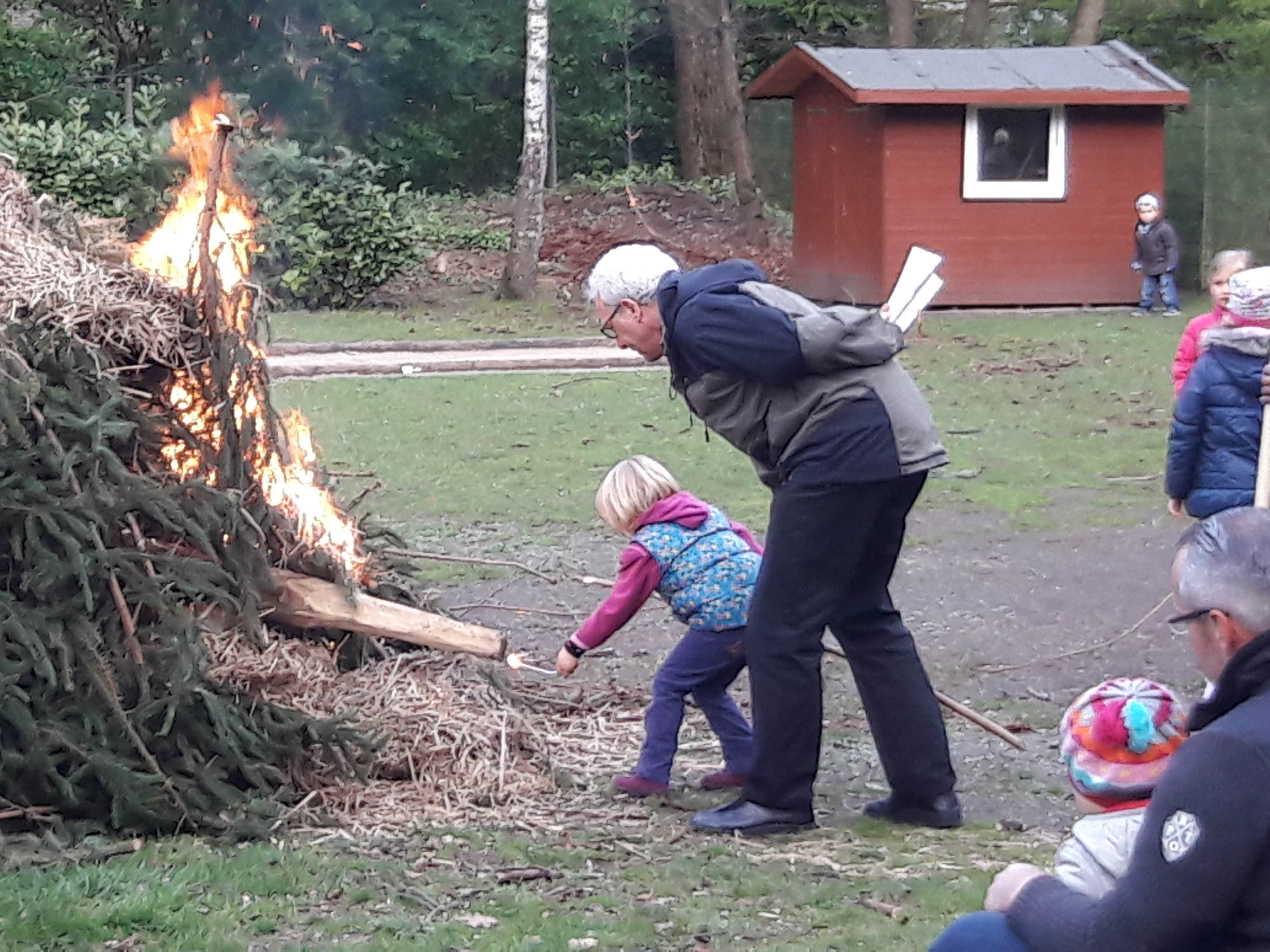 Nach einer kurzen Andacht entzündete Katharina geschickt und furchtlos unter Anleitung von Pfarrer Hüsing das Osterfeuer auf der Wiese hinter der Marienkirche.