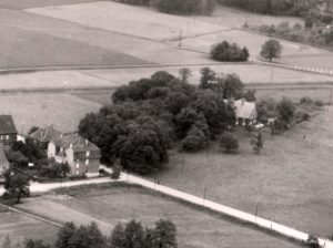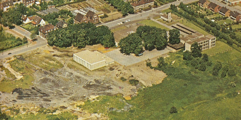 Gerhart-Hauptmann-Realschule ca. 1966. Der Sportplatz wird gerade gebaut, die Sporthalle steht. „Unsere“ Eichen verdecken den naturwissenschaftlichen Trakt (Flachbau entlang der Bismarckstraße, heute Caritas-Bildungszentrum). Luftfoto: Freigeg. Reg. Präs. Dsdf. Nr. 9/19332