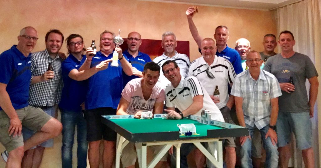 Stolz präsentiert sich Heiko Lange (links), Sieger dieses alle 2 Jahre stattfindenden Turniers und 1. Vorsitzender des Mariener Sportvereins Dorsten 1977 e.V. mit seinem Pokal, neben ihm der Organisator Ralf Gatza.