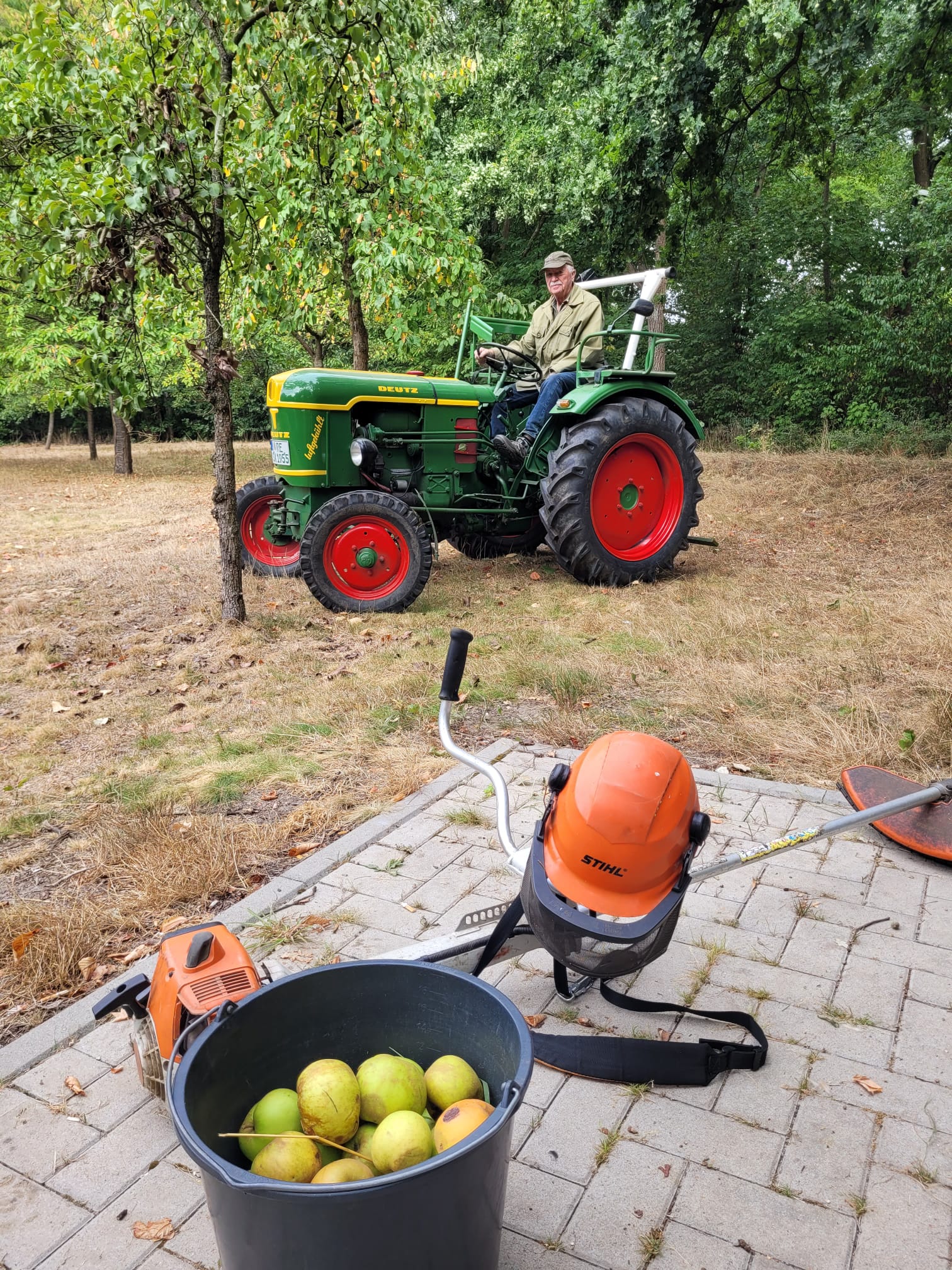 Erste Vorbereitungen für das Sommerfest zwischen Bücherzelle und Streuobstwiese. 2.9.2022 Karl-Heinz Spickermann mit dem Balkenmäher am alten Deutz und Franz-Josef Gövert mit dem Freischneider brachten den „Festplatz“ Streuobstwiese etwas in Schuss, eine staubige Angelegenheit … Und was findet man, wenn man im September in solch einem „Früchte-Garten“ mäht?