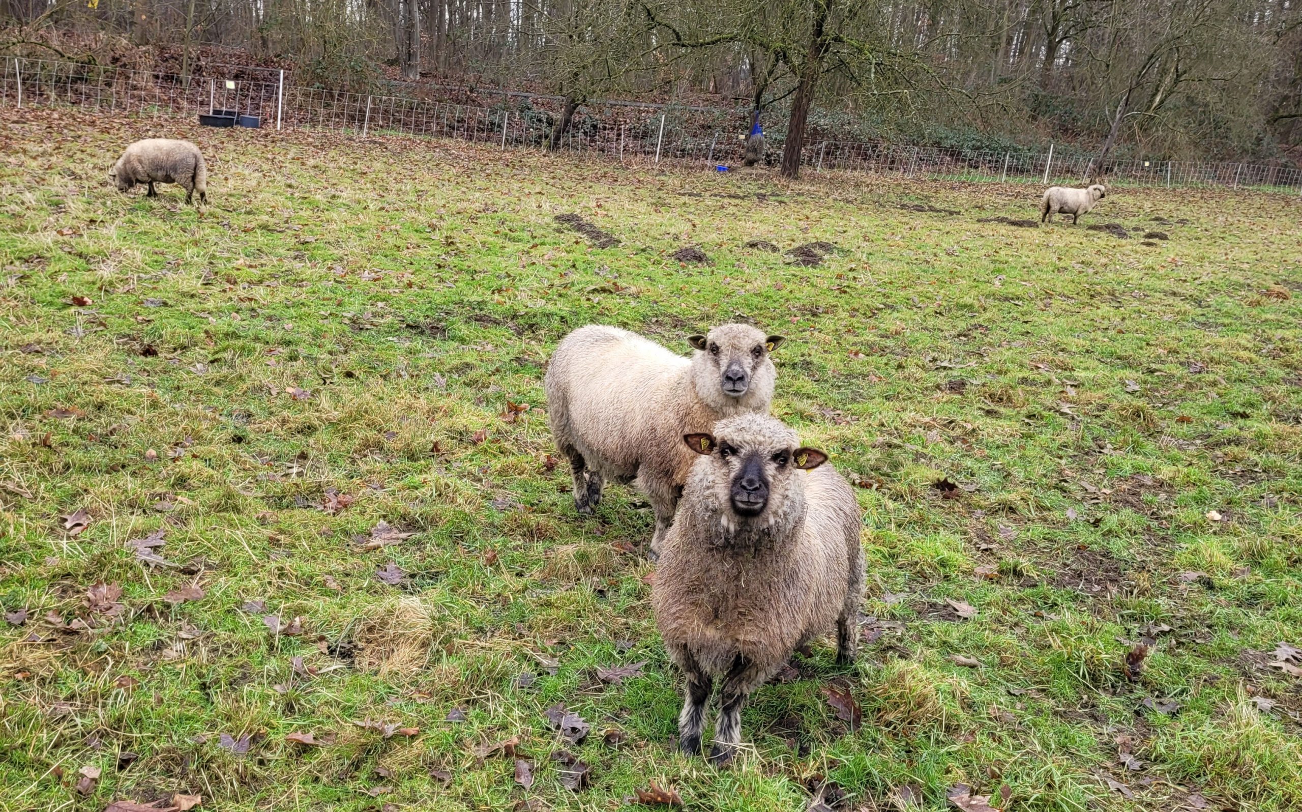 Letzte Sicherheitsvorkehrungen, raus aus dem Hänger – und dann nehmen die Shropshire-Schafe freudig ihre Arbeit auf. Eine wichtige Eigenschaft dieser Schafe für die Landschaftspflege ist, dass sie nur Gras fressen und keine Rinde abschälen. Sie eignen sich also besonders gut als Rasenmäher auf Streuobstwiesen wie hier und z. B. in Weihnachtsbaumplantagen. [videopack id=“7059″]https://marienviertel.de/wp-content/uploads/2022/02/WhatsApp-Video-2022-02-05-at-19.55.37.mp4[/videopack] … Und…
