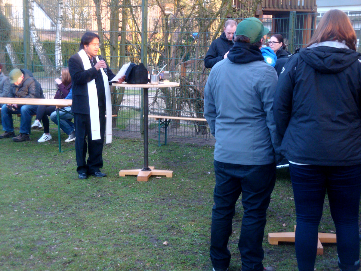 Pastor Manuel Poonat betonte in seinen einführenden Worten den Wandel des Osterfeuers von einem liturgischen Feuer hin zu einem gemütlichen Abend unter Nachbarn und Gemeindemitgliedern und begrüßte den Wert dieses kommunikativen Miteinanders für die Gemeinschaft.