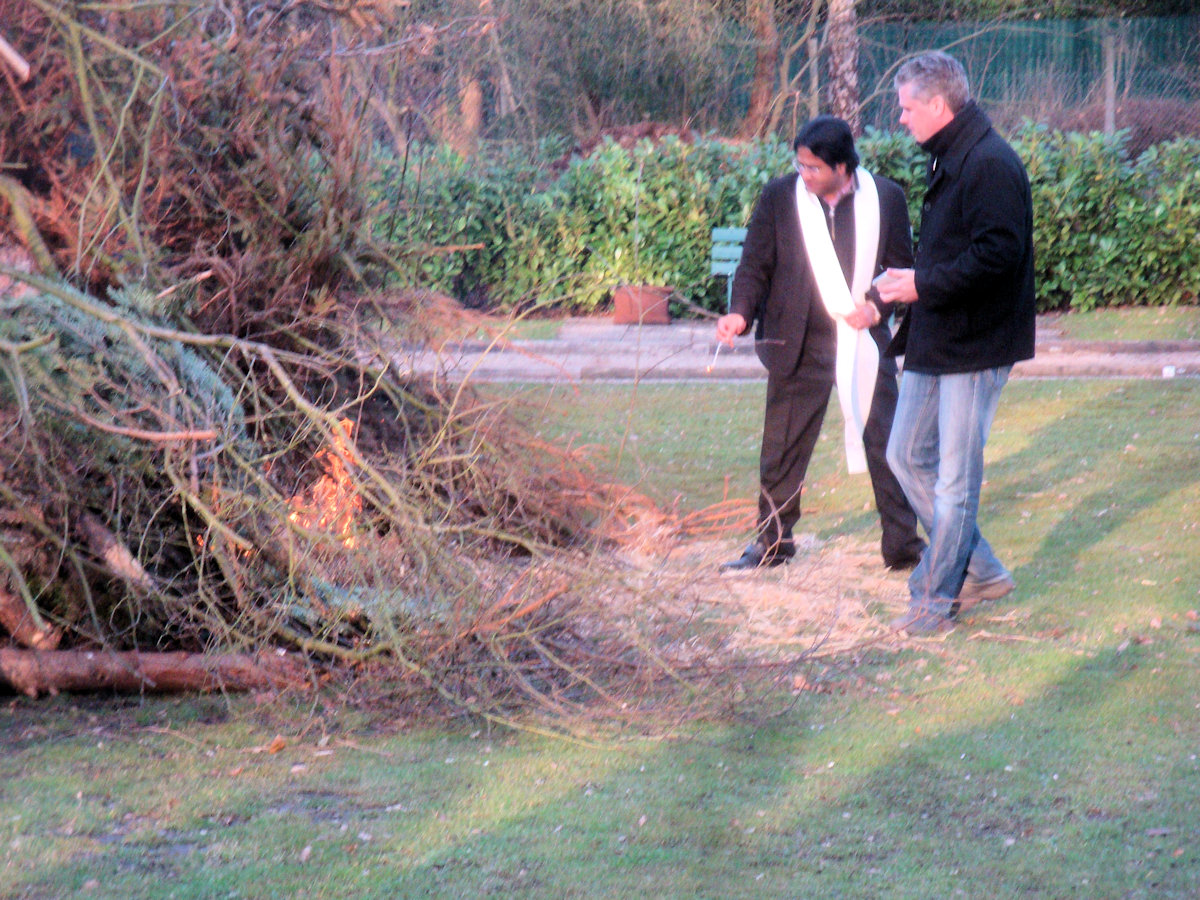 Nach einem Gebet, einem Lied und der Segnung entzündete Manuel Poonat gemeinsam mit dem Vorsitzenden des Schützenvereins, Thorsten Kotus, das Feuer mit dem Licht der Osterkerze. Schnell loderte es auf.