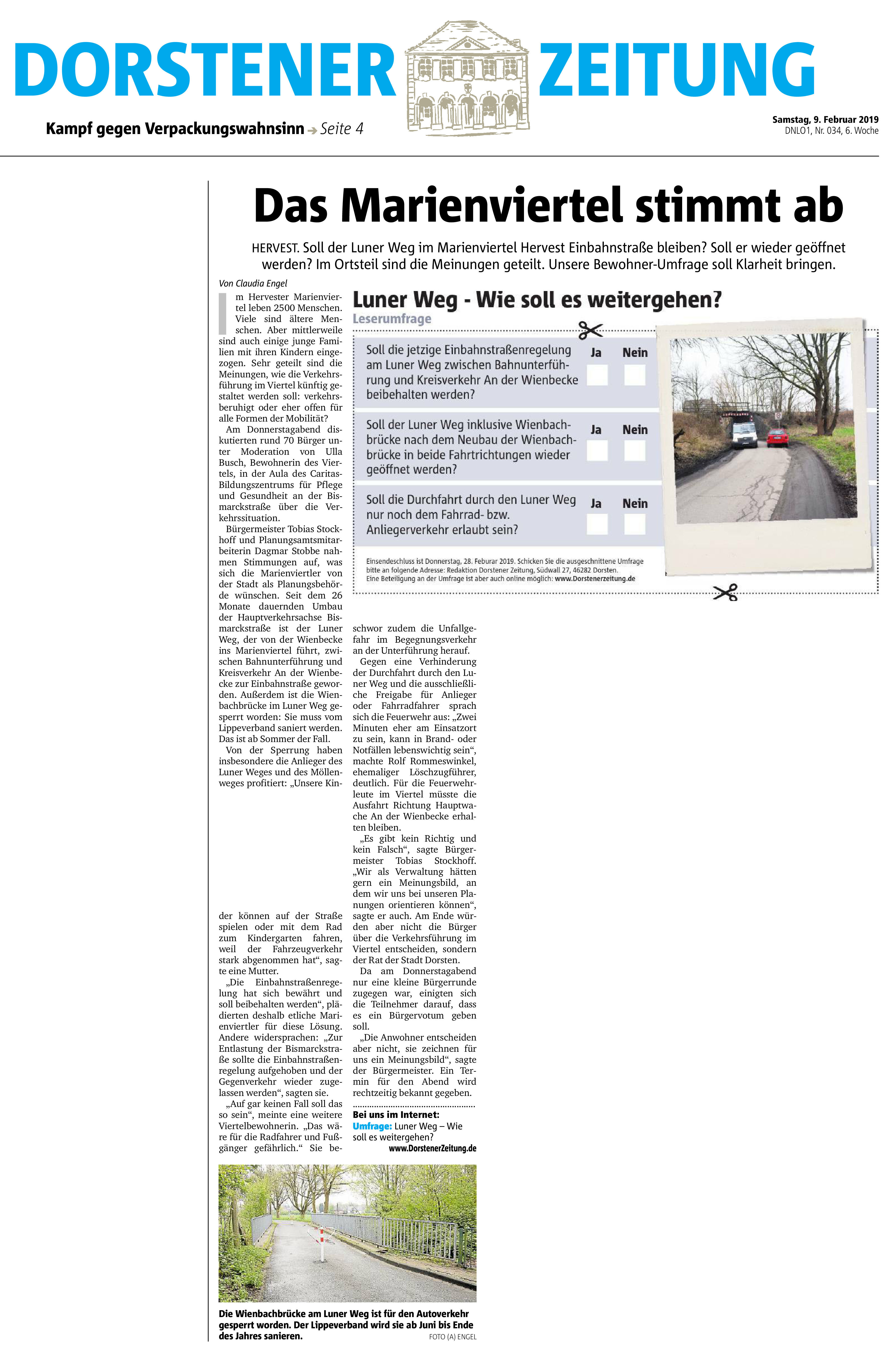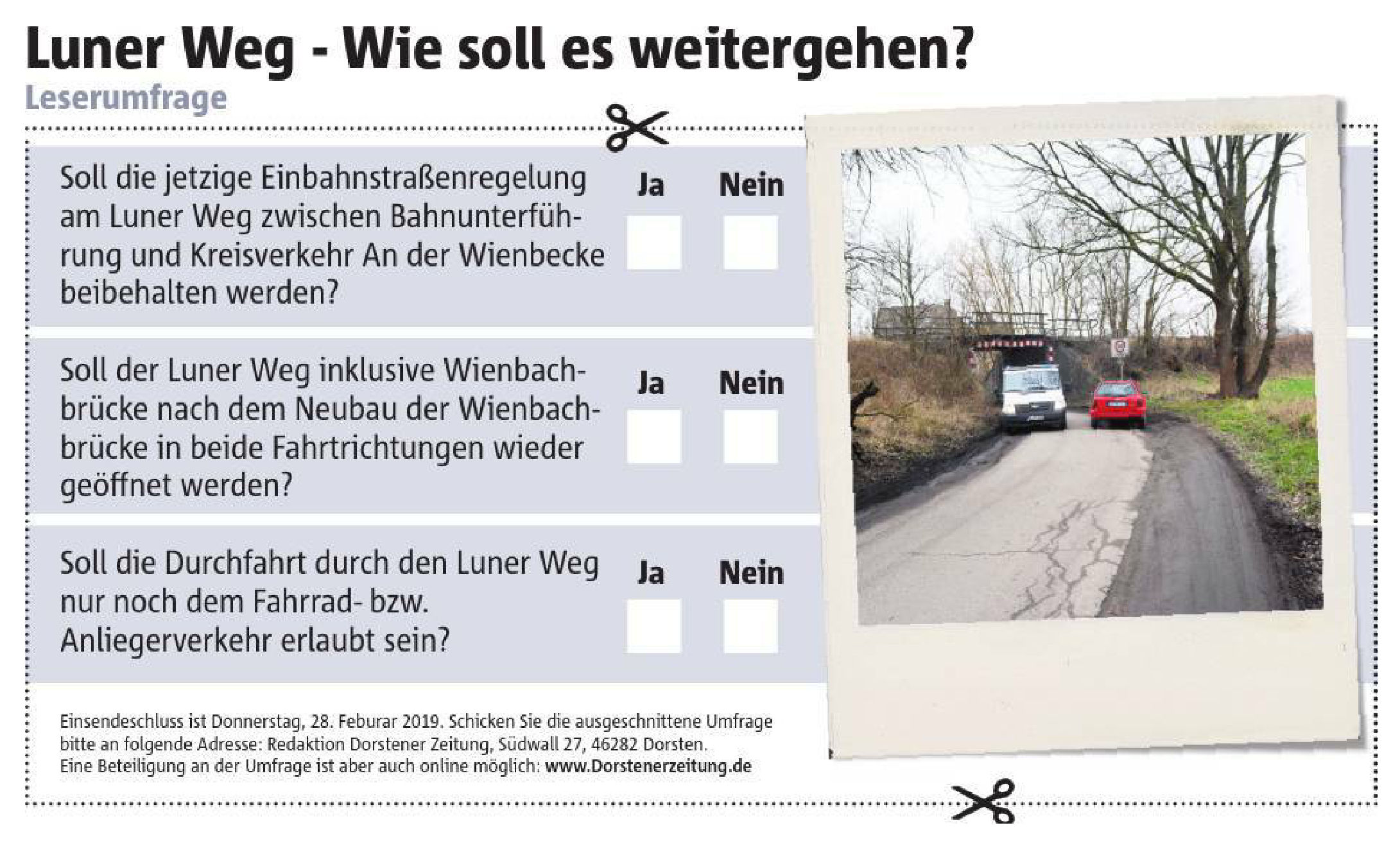 Und so initiiert die Dorstener Zeitung eine Befragung der Marienviertler*innen (und ganz klar ’nur‘ eine Umfrage und keine Abstimmung!) über die künftige Verkehrsführung am Luner Weg, die sowohl ‚analog‘ über ein ausgeschnittenes Zettelchen als auch online (www.dorstenerzeitung.de) erfolgen kann.