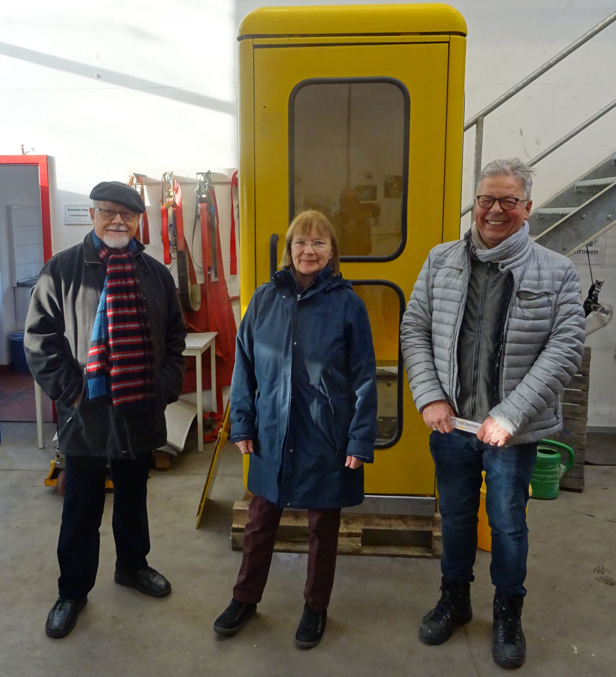 Monika Berendsen  im Februar 2020 vor der Zelle in der Halle der Dorstener Arbeit. Re Rainer Engenhorst, Planer & Baumeister, li Werner Springer (IZM), der den Kontakt zur Dorstener Arbeit vermittelte