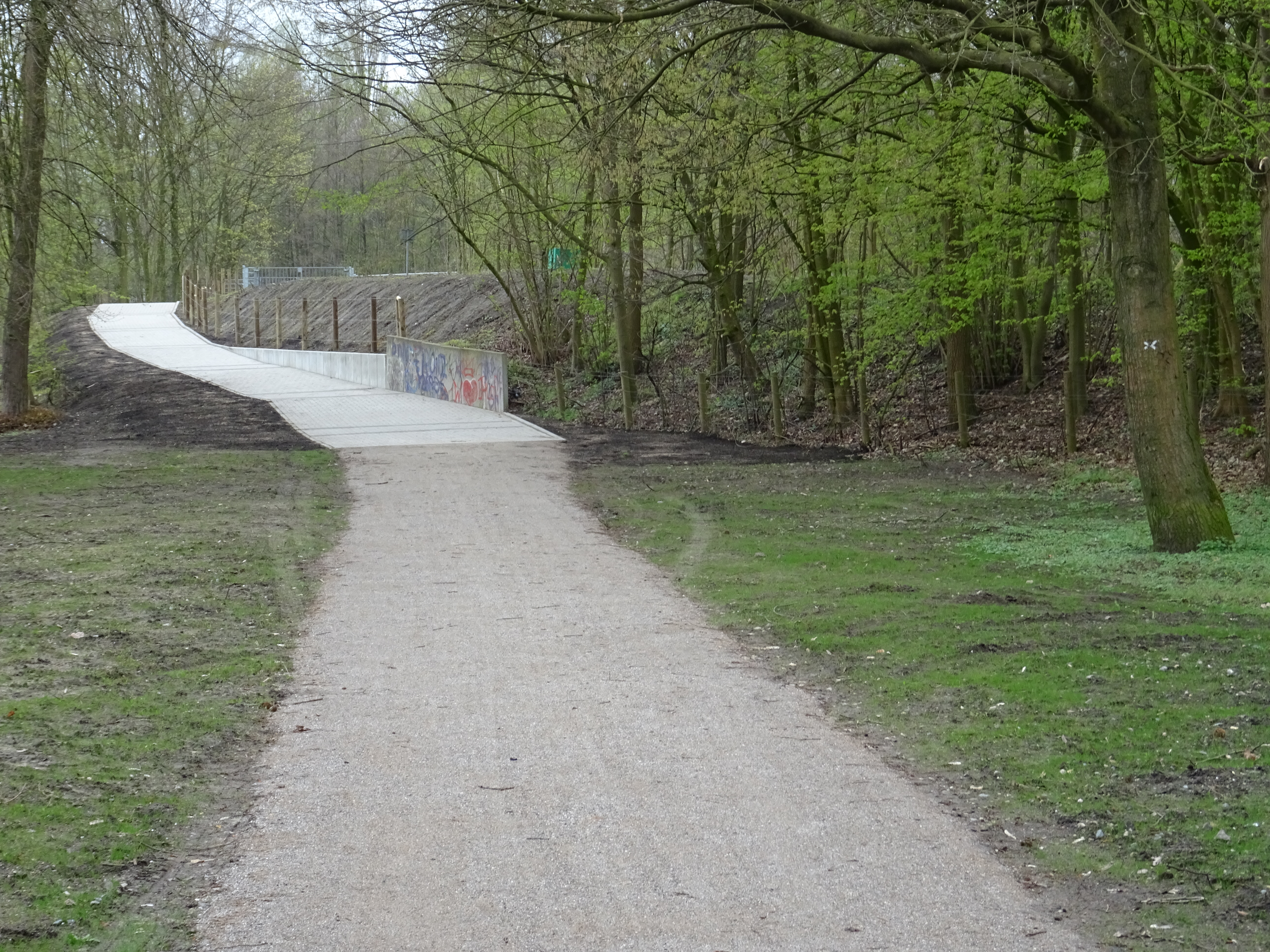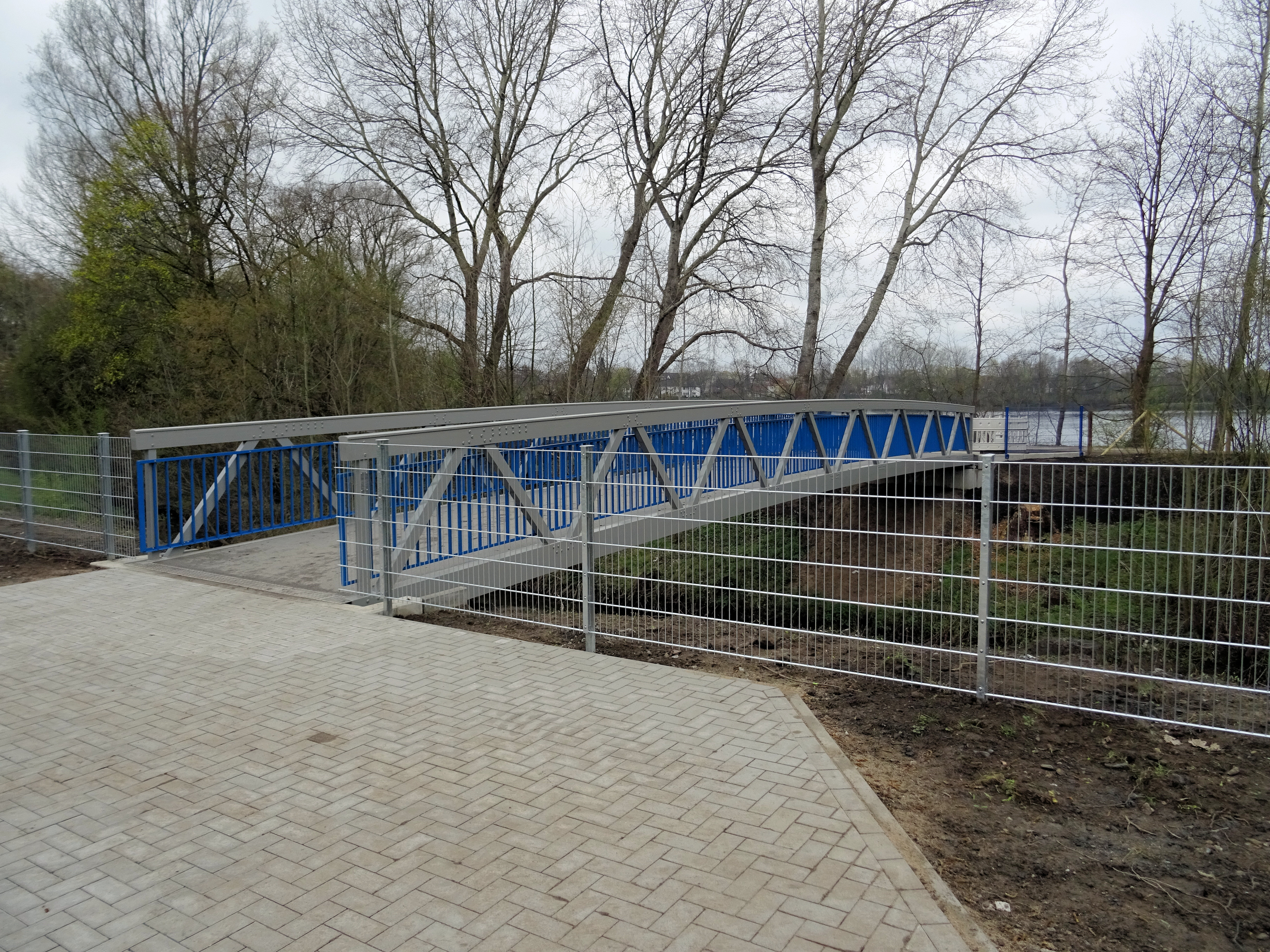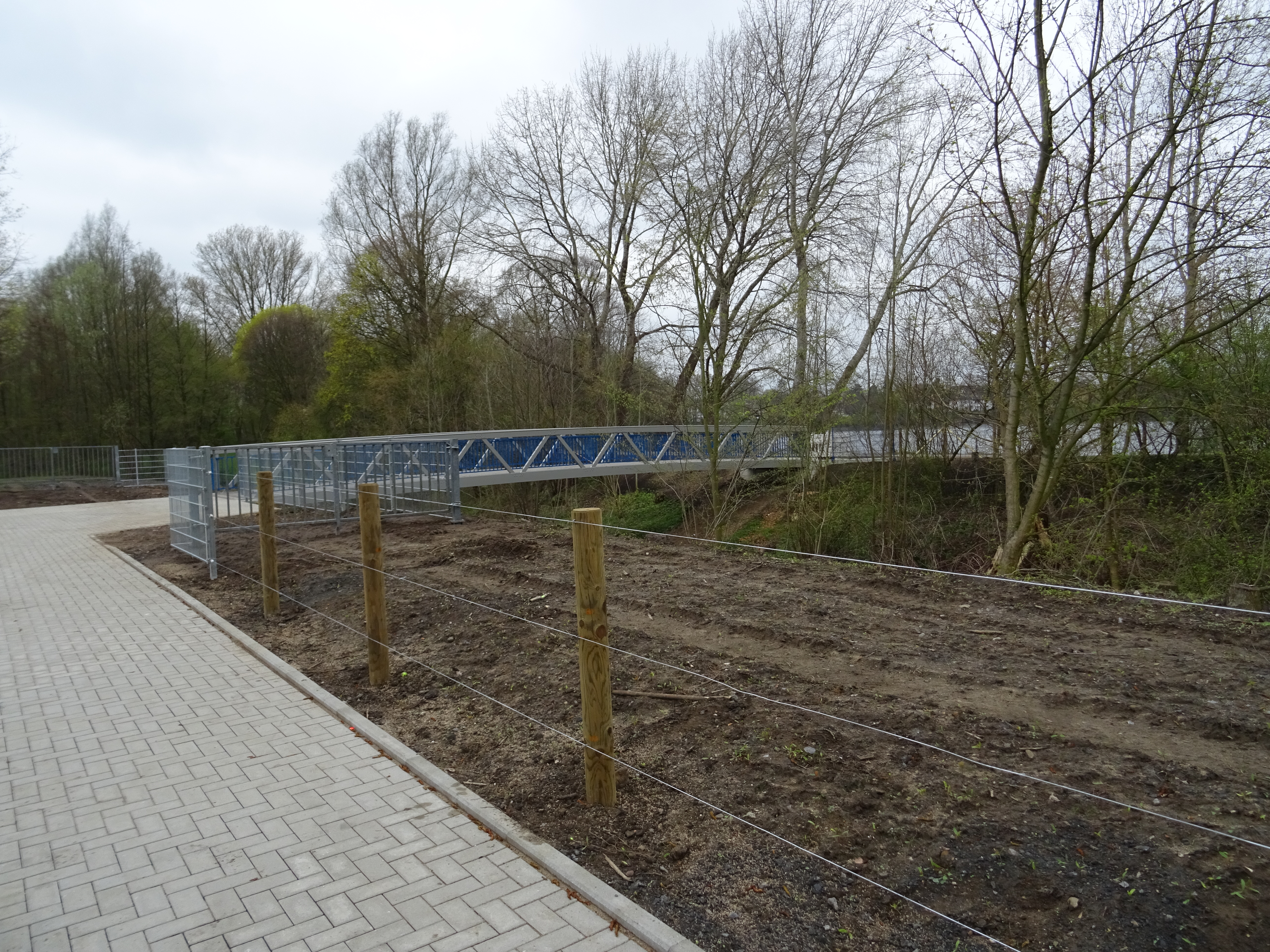 Hübsch ist sie geworden auch ohne die Knüppelholz-Romantik der Vorgängerin. Praktisch ist sie auch: die stark verlängerte Zuwegung vom Strandbad aus ermöglichte eine Steigung, die auch für Rolli-FahrerInnen und Eltern mit Kinderwagen gut zu packen ist. Dazu musste der Weg zur Brücke verlegt werden: er führt nicht mehr – von der Straße Am Strandbad aus gesehen – links am Spielplatz vorbei, sondern rechts und bietet so auch eine nette Anbindung an die Königswiese der Marienschützen und das geplante Kneipp-Becken. Breit genug ist sie auch: Zwei Radfahrer können sich dort unfallfrei und ohne abzusteigen begegnen.