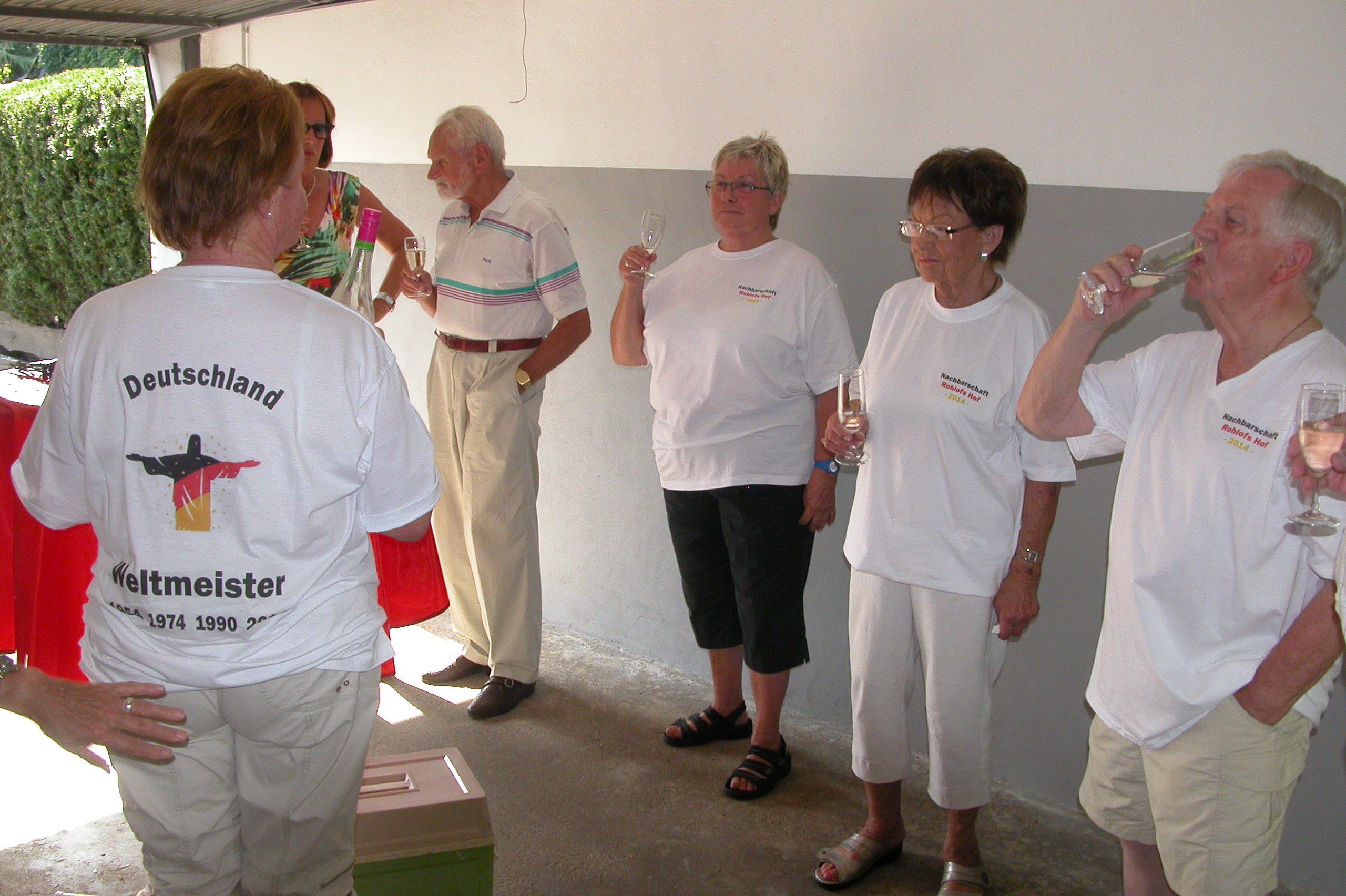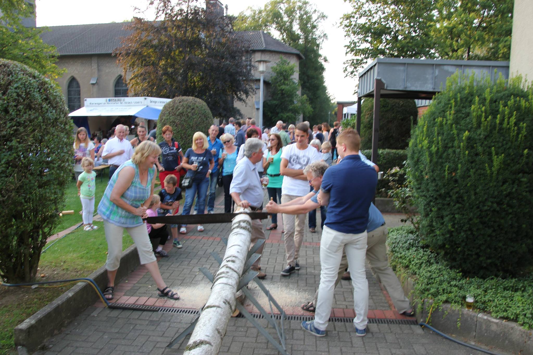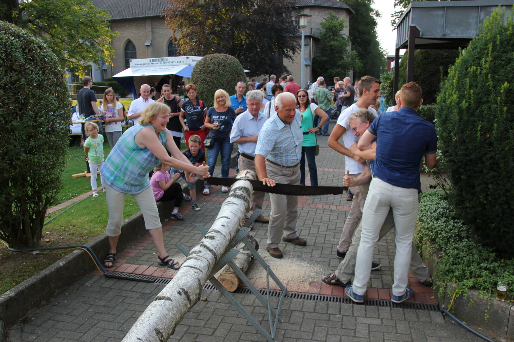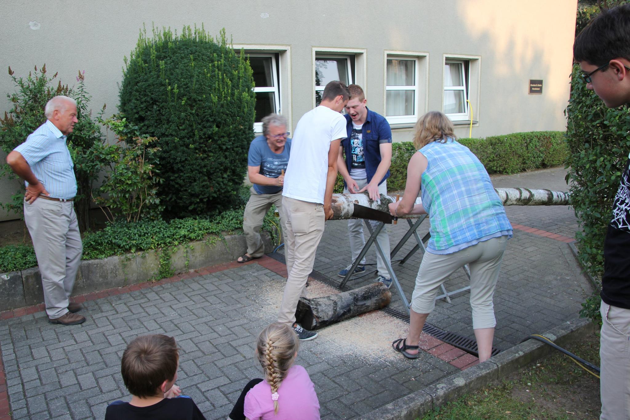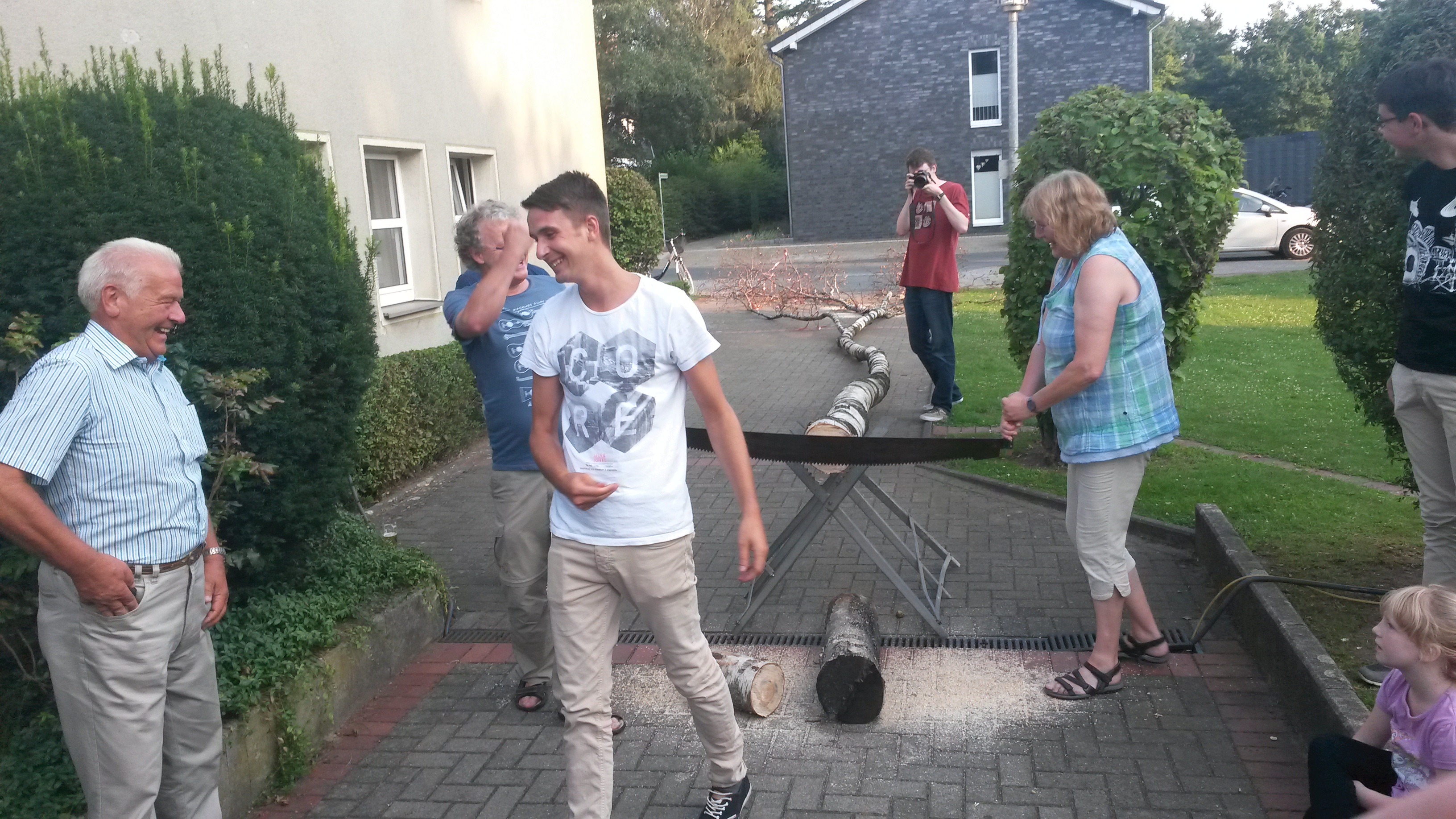 Der Maibaumkönig 2014, Jürgen ‚Jimmy‘ Rohmann, lud heute, am 26. Juli, zum Sägen auf der Pfarrwiese ein, passend verbunden mit dem 25. Geburtstag seiner lieben Frau Renate (Wer hier einen Zahlendreher vermutet, verkennt diese Powerfrau! 🙂 )
