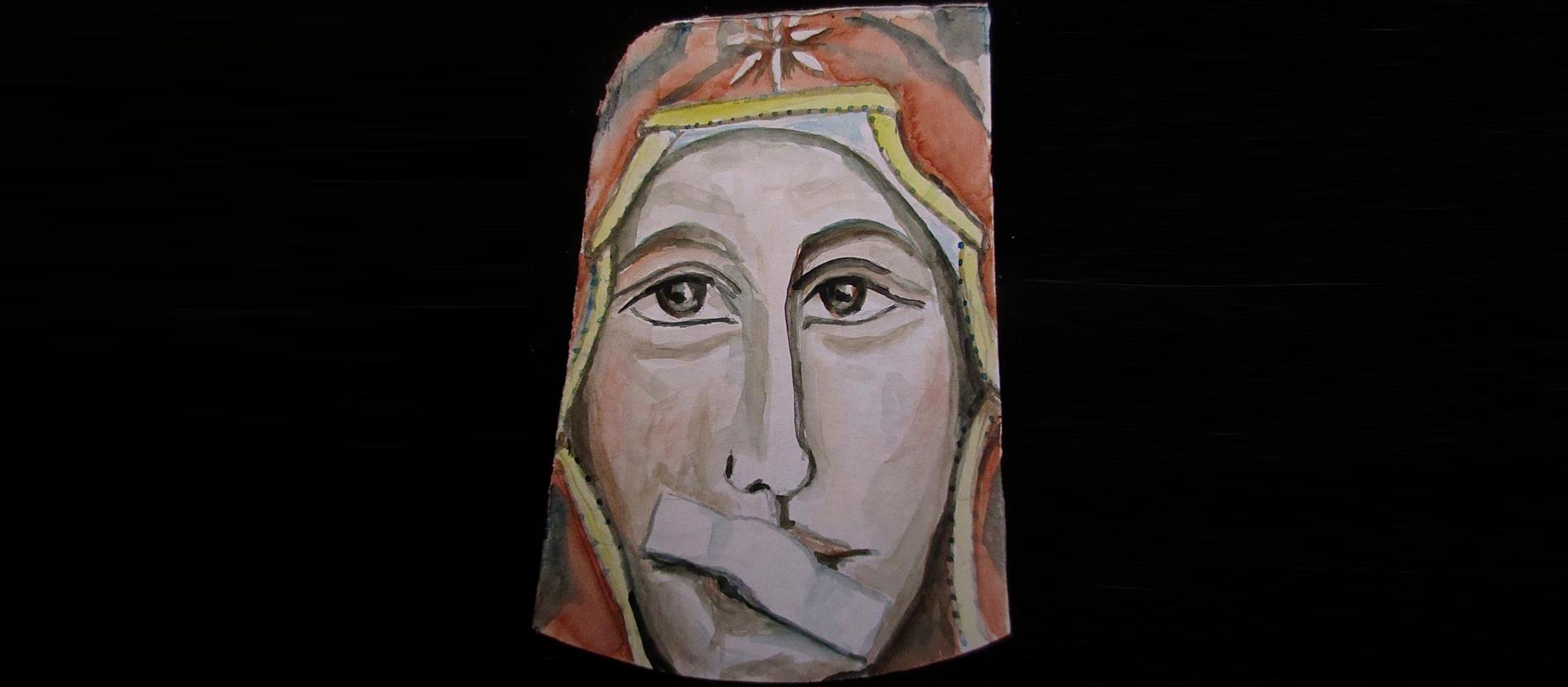 Maria mit einem zugeklebten Mund. Bis zum Kirchenstreik im Mai malt Lisa Kötter jeden Tag ein Frauenbild, das sie Frauen widmet, die zum Schweigen gezwungen wurden und werden. Eine Legende erzählt, dass der heilige Bernhard Maria Stillschweigen geboten habe auf Grund des Pauluszitats, dass die Frau in der Kirche zu schweigen habe. Bild: © Lisa Kötter