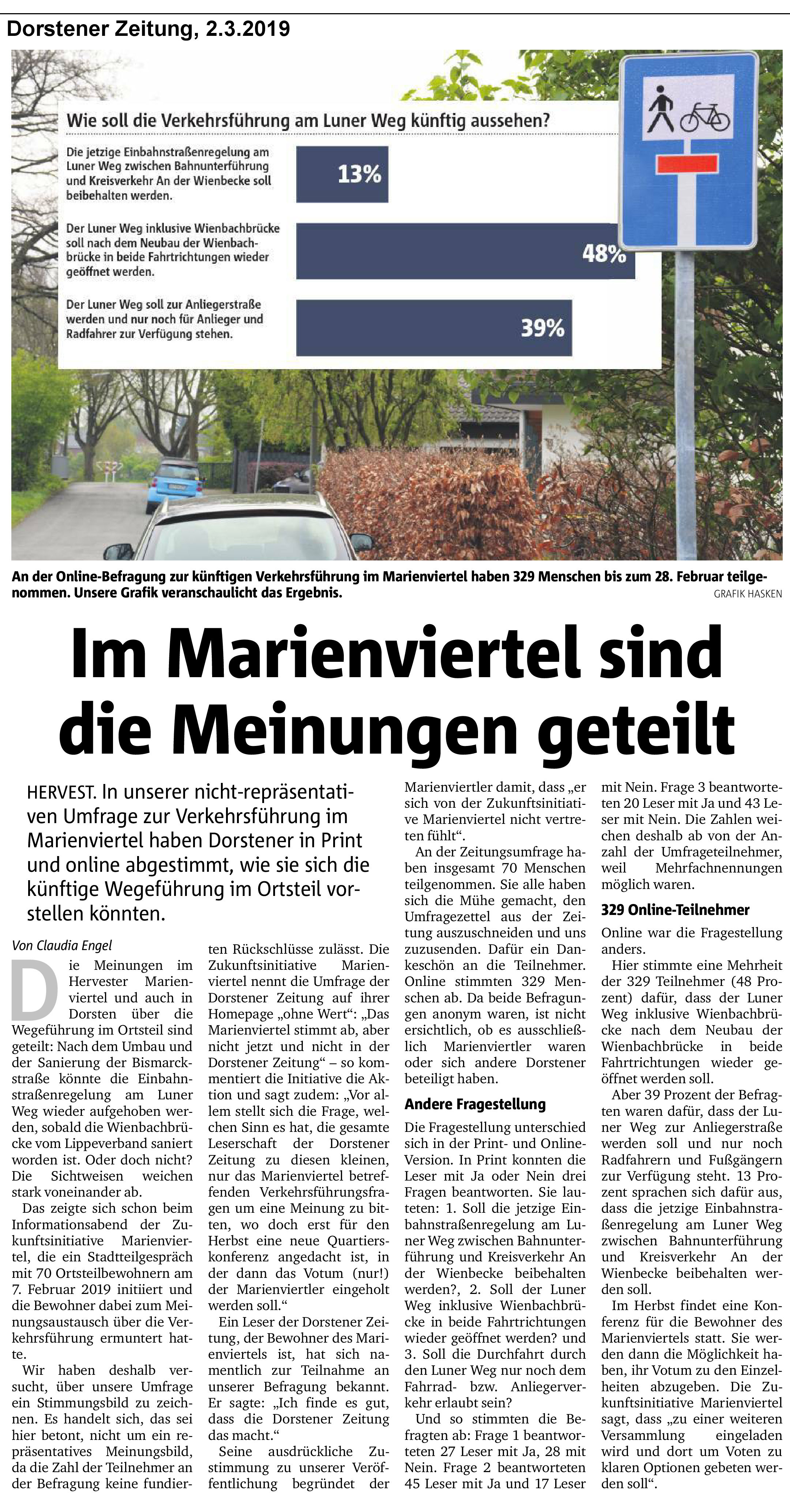 In der Samstagsausgabe veröffentlichte die Dorstener Zeitung das Leserumfrage-Stimmungsbild zur Verkehrsführung an den beiden ‚Knackpunkten‘ des Luner Wegs.