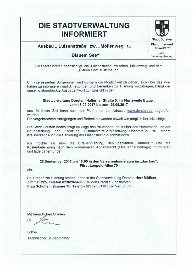 die Stadtverwaltung Dorsten hat uns, wie zugesagt, zu einer Veranstaltung eingeladen, in der sowohl die Stadtverwaltung selbst wie auch wir Anwohner unser Für oder Wider für die geplanten Erneuerungs-bzw. Sanierungsvorhaben im Bereich Kreuzung und Luisenstraße vorbringen können.