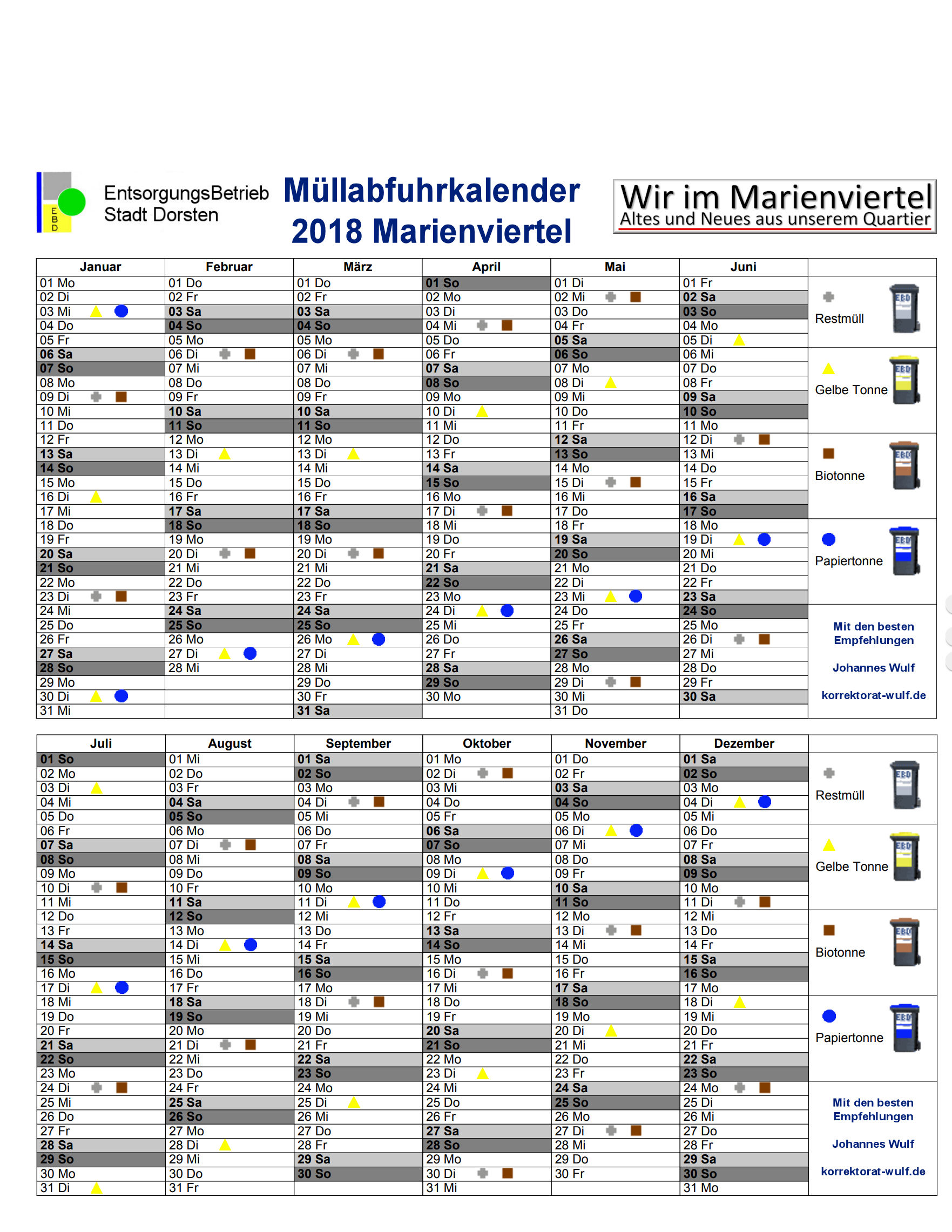 Wer sich immer schnell informieren möchte (Wann ist welche Tonne dran): Hier gibt es den Abfallkalender 2018 für das Marienviertel zum Ausdrucken!