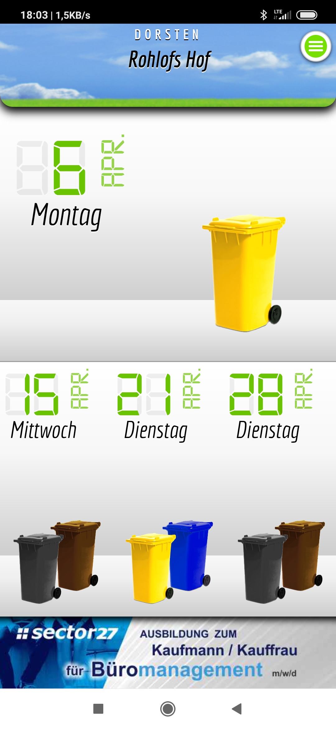 Am nächsten Montag wird schon die Gelbe Tonne abgeholt (wg. Karfreitag), Schwarz und Braun sind erst am Mittwoch nach Ostern dran (wg. Ostermontag).