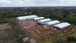 Ein Team vom Zeltverleih ‚T Hekeltje aus Alkmaar/NL ist fleißig dabei, Zelte für Kriegsflüchtlinge auf dem Sportplatz der ehemaligen Gerhart-Hauptmann-Realschule an der Bismarckstraße aufzubauen.