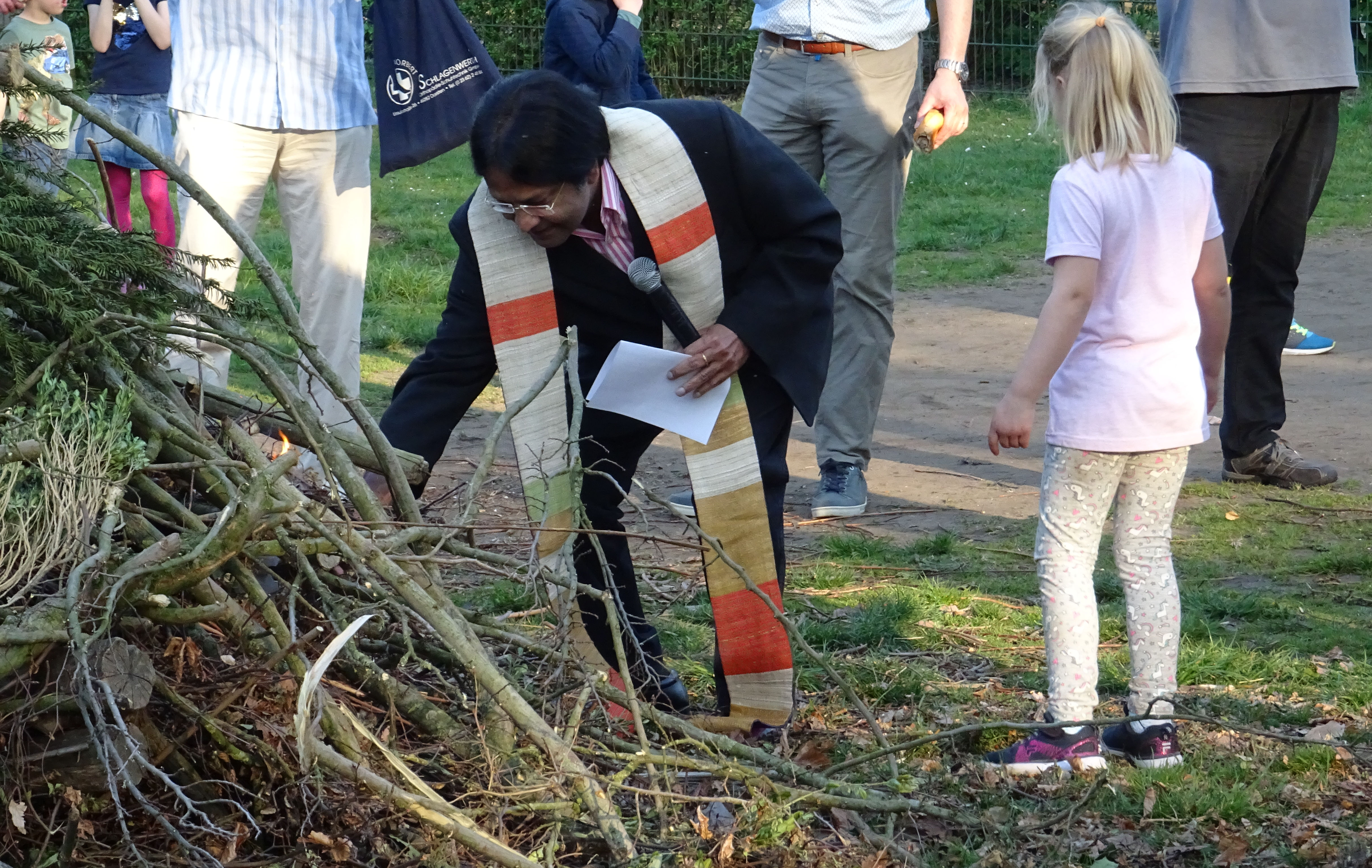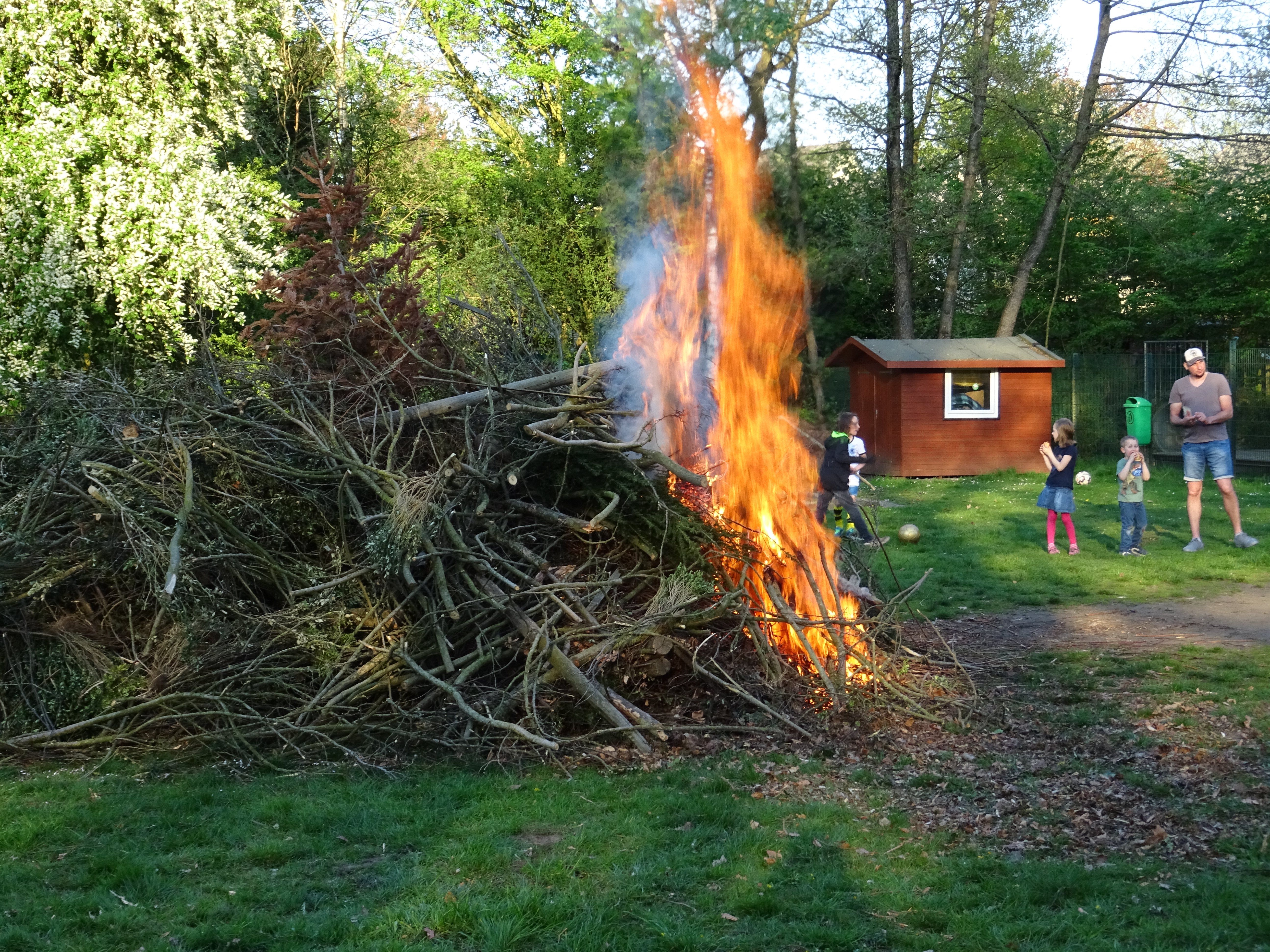 Mit viel Spaß sprangen die vielen Kinder um das Feuer, hier und da noch einen Zweig, einen Ast hineinwerfend, während die Erwachsenen einander frohe Ostern wünschten und bis tief in die Dunkelheit ins Gespräch, ins Quatschen, ins Kennenlernen kamen.