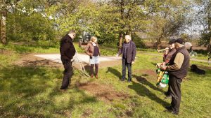 Einige Aktive der Initiative Zukunft Marienviertel trafen sich heute Nachmittag bei durchwachsenem Wetter, aber unter blühenden Apfelbäumen im Biotop, um einige Flächen dort für die Einsaat der „Vestischen Wildblumenmischung“ vorzubereiten und auszusäen. Diese Mischung ist genau abgestimmt auf die Bedürfnisse heimischer Insekten. Ein Teil der im vergangenen Jahr eingebrachten Wildblumensaat geht derzeit auf, ein Teil ist aber auch der Trockenheit und hungrigen Mäusen und Vögeln zum Opfer gefallen. Hoffen wir, dass unsere Insekten in diesem Jahr und den folgenden einen reich gedeckten Tisch finden! Ein langer Atem ist aber vonnöten, denn die Wiese braucht ein paar Jahre, bis sie sich wie gewünscht entwickelt und stabilisiert hat.
