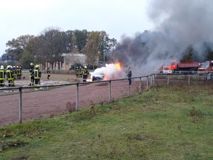 Gut, dass es ’nur‘ eine Übung war, gut, dass niemand zu Schaden gekommen ist, gut, dass die Feuerwehrleute einen Platz auf dem Sportplatz gewählt haben, von dem aus die Anwohner kaum durch den Geruch belästigt wurden, wichtig, dass die Brandbekämpfung geübt wird!