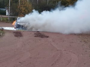 Raus aus dem Garten, rüber zum Loch im Zaun, Gewissheit: Es brannte bewusst und zur Übung an einem neuen Löschsystem ein altes Auto kontrolliert ab.