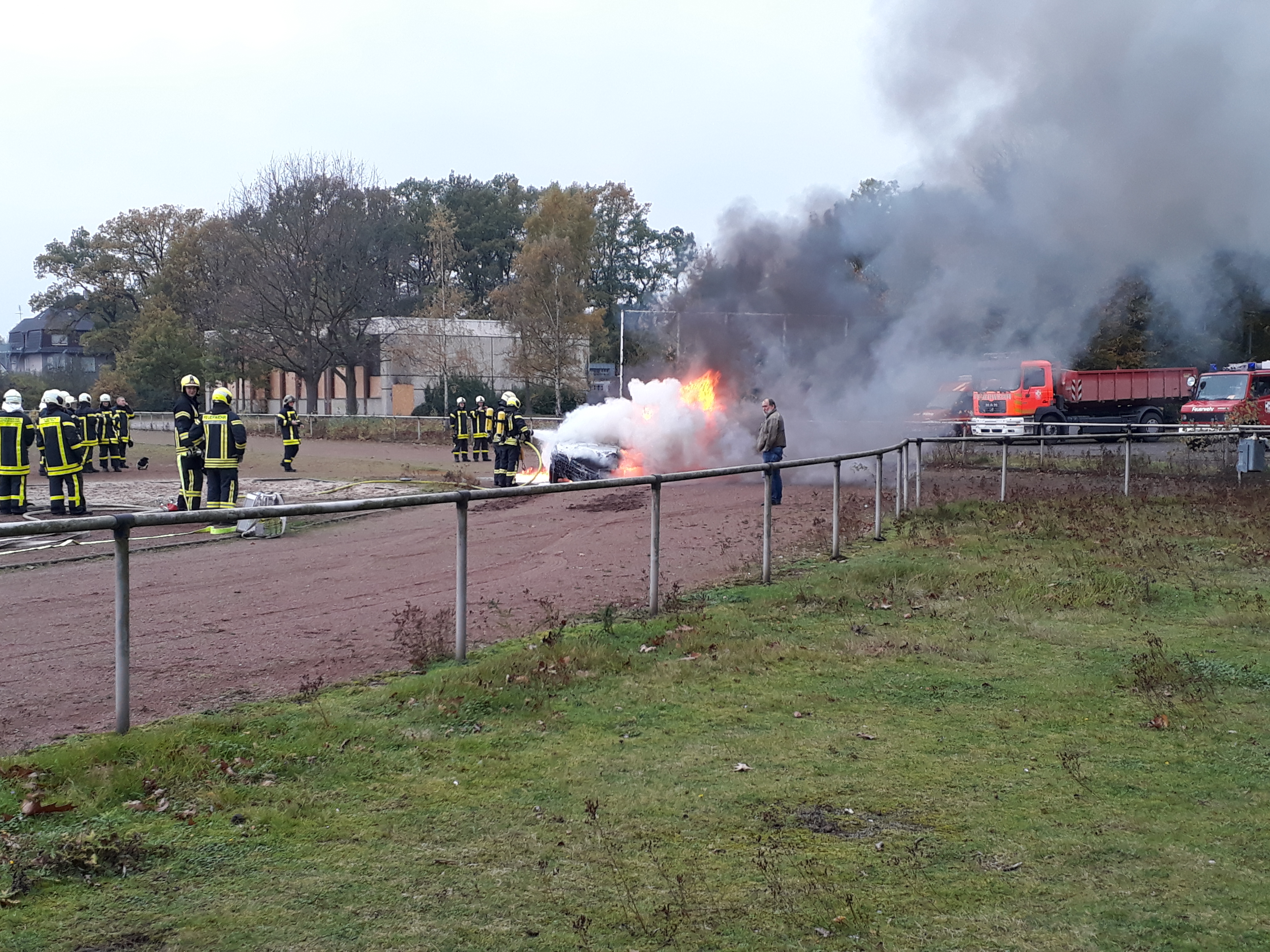 Raus aus dem Garten, rüber zum Loch im Zaun, Gewissheit: Es brannte bewusst und zur Übung an einem neuen Löschsystem ein altes Auto kontrolliert ab.