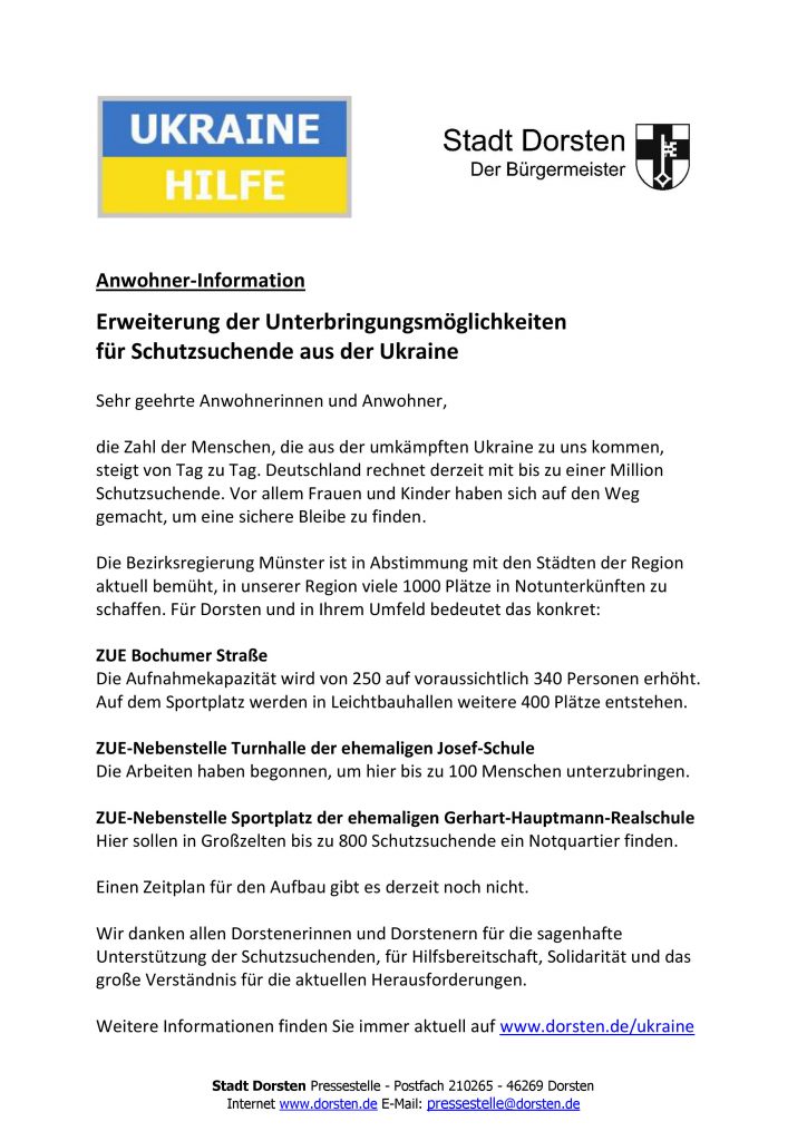 Es ist uns wichtig, die Bürgerinnen und Bürger so früh wie möglich zu informieren – auch wenn das nicht immer möglich ist, weil die Ereignisse sich manchmal überschlagen. Die Ausweitung der Kapazitäten zur Flüchtlingsunterbringung wurden am gestrigen Montag im Krisenstab der Bezirksregierung beschlossen, am späten Nachmittag wurde dazu eine Pressemitteilung veröffentlicht, die Sie unter dem folgenden Link nachlesen können: https://www.bezreg-muenster.de/de/presse/2022/2022-03-21_ausweitung_unterkunftsplaetze/index.html