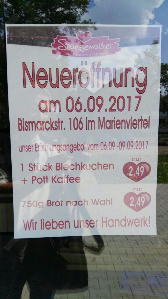Eine Bereicherung des ohnehin schon hochwertigen Backwarenangebots im Marienviertel startet am Mittwoch: Die Raesfelder Bäckerei Spangemacher eröffnet Laden und Stehcafé im Gebäude der früheren Gerhart-Hauptmann-Realschule, also mitten im Quartier. Direkt vor dem Ladenlokal gibt´s für die, die unbedingt mit dem Auto fahren müssen, ein paar ‚Brötchenparkplätze‘; mit dem Rad geht´s allerdings genauso schnell 🙂
