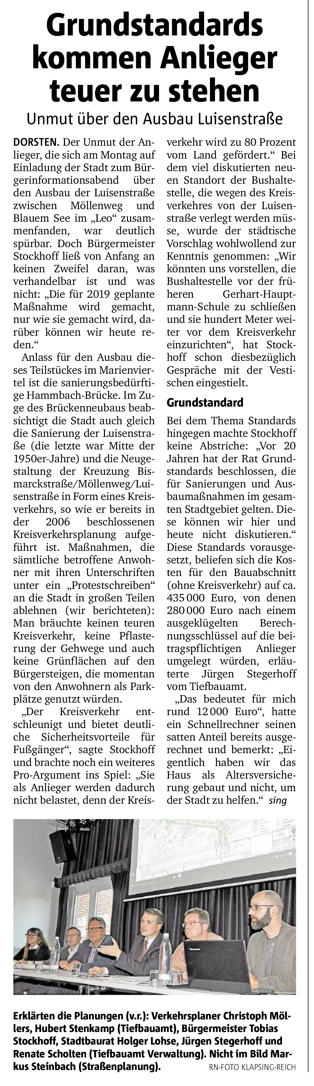 Klar ging es ums Geld und das manchmal turbulent: Wenn es bei den vorab kalkulierten 430.000 Euro für den städt. Anteil an der Baumaßnahme bleibt, werden die Anwohner mit ca. 280.000 Euro zur Kasse gebeten, macht beim Einfamilienhaus 15 Euro pro Quadratmeter Grundstück, jede weitere Etage kostet mehr … alles festgelegt in der städtischen Satzung, alles gleichermaßen gültig für alle Anwohnerbeteiligungen an Straßenbaumaßnahmen, alles „zigfach ausgeurteilt“, wie Stockhoff im Juristensprech anmerkte. Überrascht, freudig überrascht, waren viele Anwohner, als sie hörten, dass nur die reinen Straßen- und Bürgersteigsanierungsmaßnahmen in Rechnung gestellt werden; die recht weitläufigen Anschlüsse an die Hammbachbrücke und die vier Zuwegungen zum neuen Kreisverkehr gibt´s für die Anwohner umsonst.