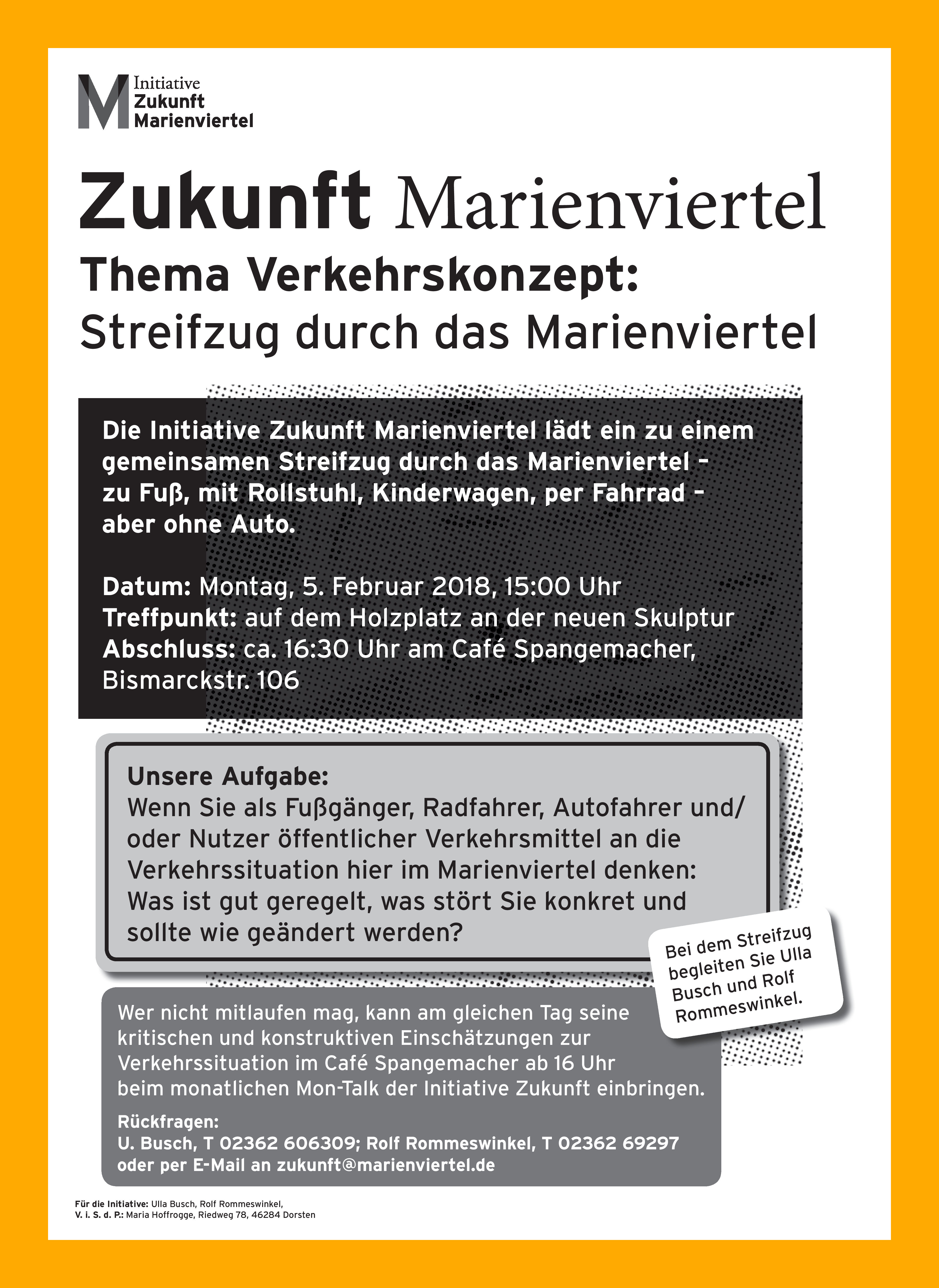 Es begleiten Sie und hören aufmerksam zu Ulla Busch und Rolf Rommeswinkel, die in der Initiative Zukunft Marienviertel verantwortlich sind für die Bearbeitung des Themas ‚Verkehrskonzept‘.