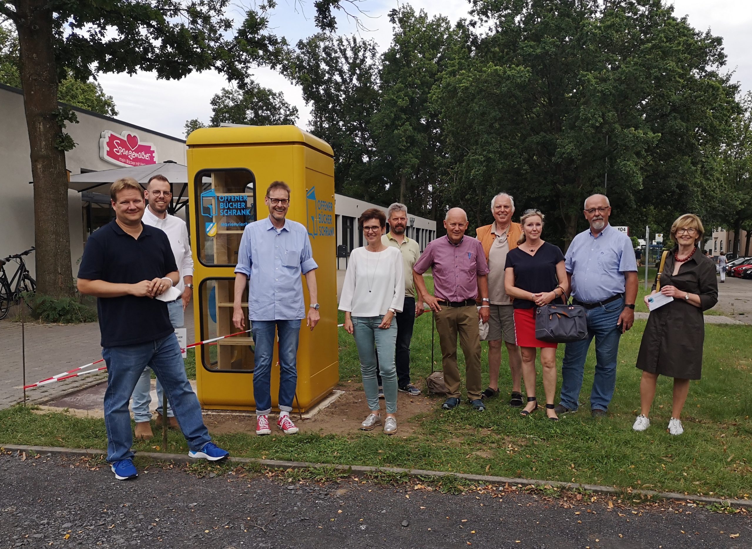 Die Teilnehmer*innen am Rundgang v.l.: Sven Volmering, Simon-Daniel Kißmer-Imping (CDU Hervest und Geschäftsführer des Schützenvereins St. Marien), Michael Mergen (CDU Hervest, Stadtrat für Hervest und IZM-Aktiver), Ursula Beckmann-Wübbelt (CDU Hervest), Ralf Niepmann (CDU Hervest und Neu-Marienviertler), Franz-Josef Gövert (CDU Hervest, Stadtrat für das Marienviertel, Aktiver der IZM), Hugo Appelhoff (Aktiver in IZM und Kulturkreis), Maria Hoffrogge (Sprecherin der IZM), Johannes Wulf (Aktiver in IZM und Kulturkreis), Ursula Bensch (Vorsitzende im Pfarreirat St. Paulus, Aktive in der IZM, Sprecherin des Kulturkreises); Foto: Dietrich Sell (Aktiver der IZM)