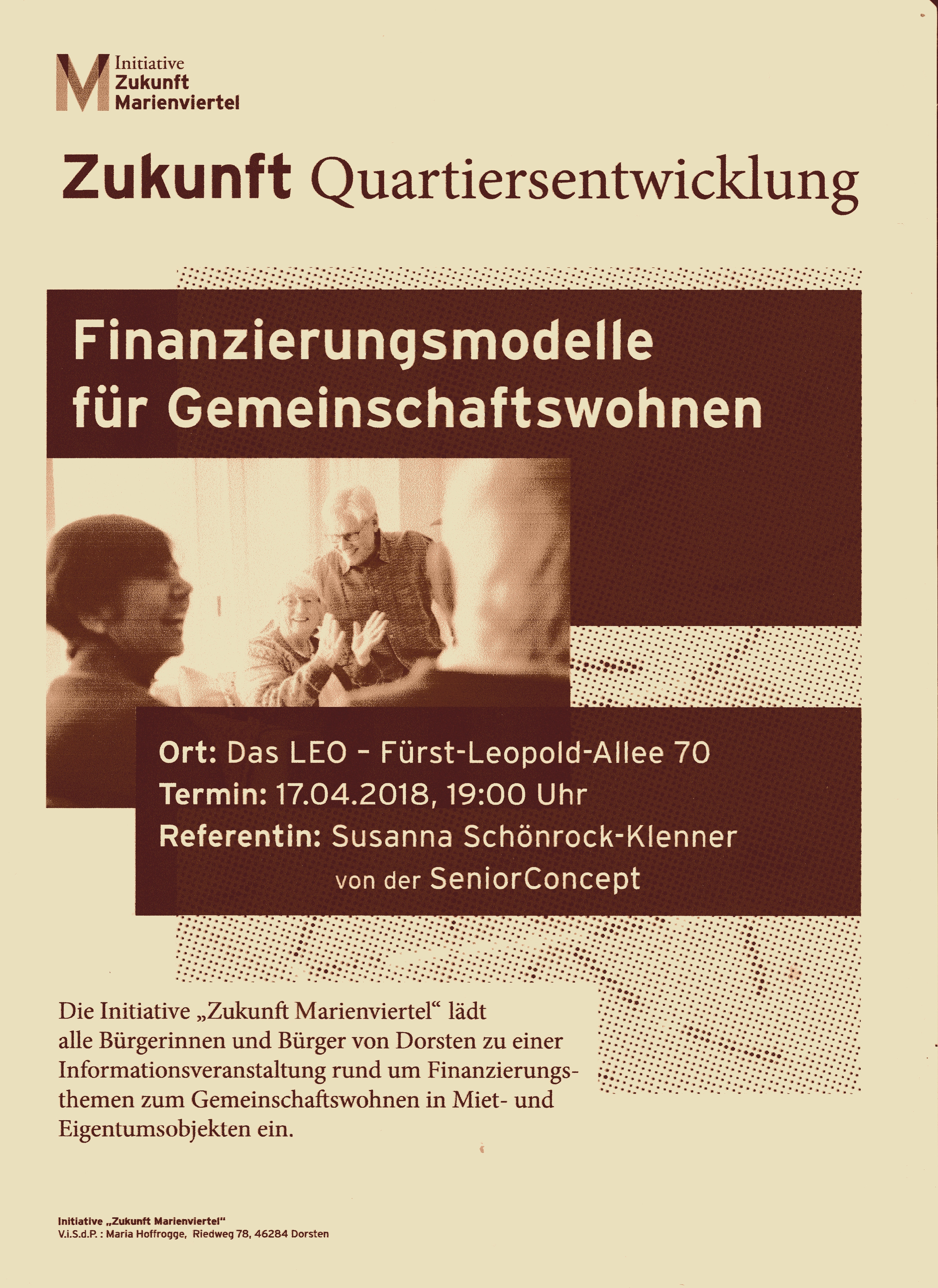 Auf dem traditionellen Weg geschieht eine derartige Projektrealisierung mit Investoren, deren Kosten jedoch ca. 20 bis 30 % über denen weitgehend unbekannter Alternativen liegen. Das Investoren-Modell und besonders diese Alternativen – bei Mietprojekten handelt es sich um ‚Bewohnergenossenschaften‘, bei Eigentumsprojekten um ‚Baugruppen/Baugemeinschaften‘ – werden in der Informationsveranstaltung gegenübergestellt und deren Vor- und Nachteile jeweils aufgezeigt.