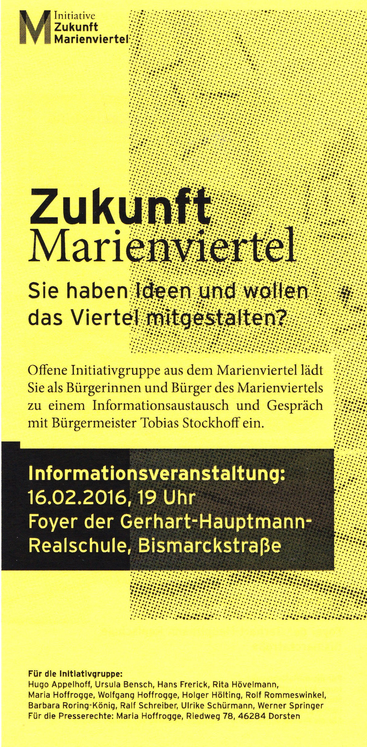 Insofern bietet der Ansatz der ‚Initiative Zukunft Marienviertel‘ enorme Chancen bei der Weiterentwicklung unseres Quartiers: umfassende Information der Bürger, kritische Fragen an Rat und Verwaltung, beherztes Mitreden, -planen, -gestalten, -machen.
